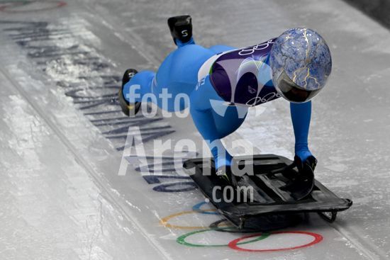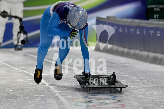 2883378 Cortina d'Ampezzo, Italia, 13 de fevereiro de 2026. Valentina Margaglio, da Italia, em acao durante as baterias 1 e 2 do skeleton feminino dos Jogos Olimpicos de Inverno de 2026 em Cortina d'Ampezzo, Italia. (Igor Kupljenik/SPP)