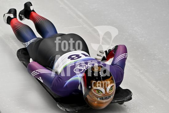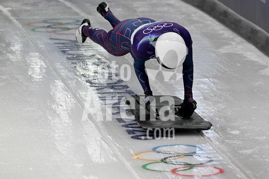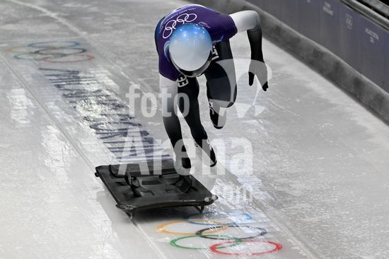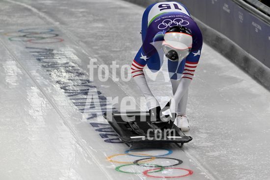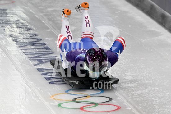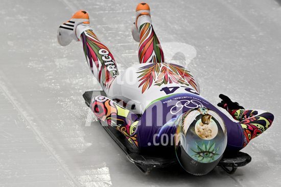 2883359 Cortina d'Ampezzo, Italia, 13 de fevereiro de 2026. Kelly Curtis, dos Estados Unidos, em acao durante as baterias 1 e 2 do skeleton feminino nos Jogos Olimpicos de Inverno de 2026 em Cortina d'Ampezzo, Italia. (Igor Kupljenik/SPP)