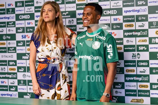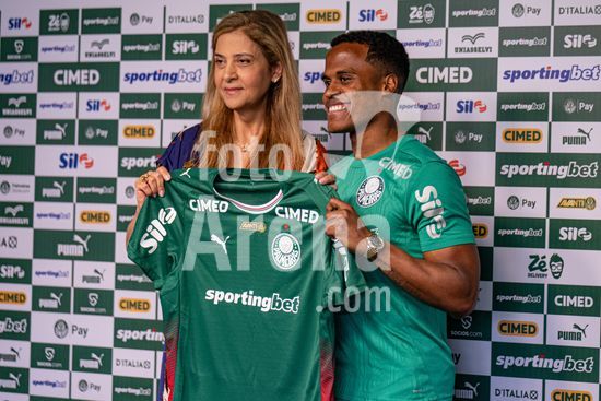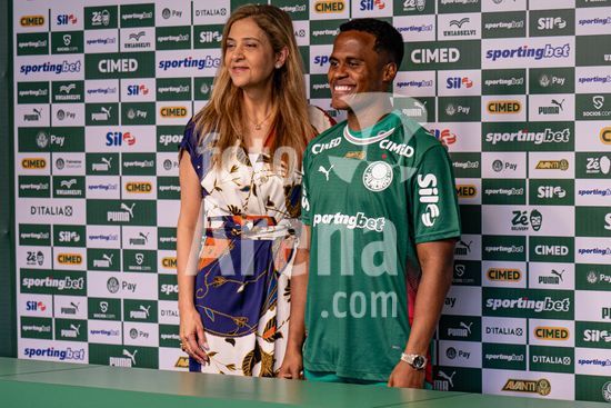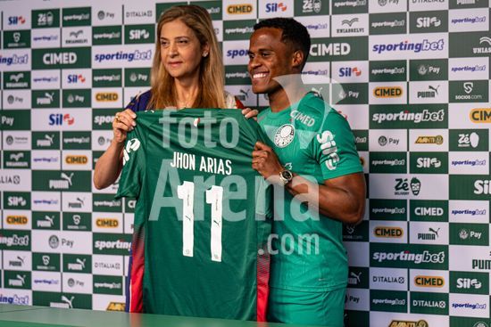 2883420 Jhon Arias, do Palmeiras, e a presidente do Palmeiras, Leila Pereira, durante entrevista coletiva de apresentacao de Jhon Arias, nova contratacao do Palmeiras vindo do Wolverhampton Wanderers, da Inglaterra. (Riquelve Nata/SPP)
