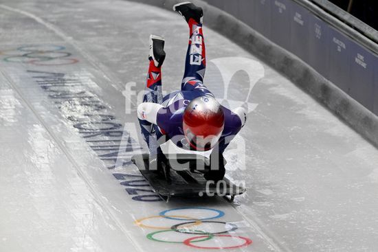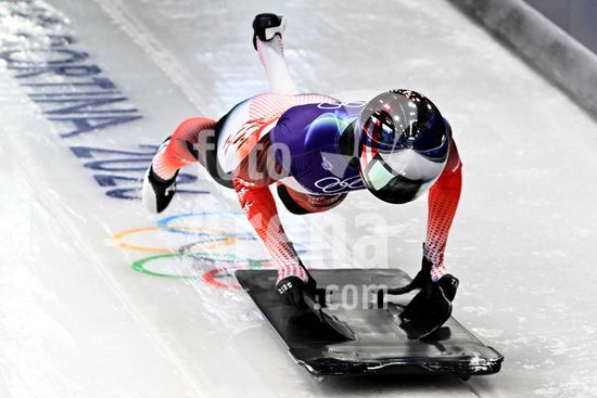 2883372 Cortina d'Ampezzo, Italia, 13 de fevereiro de 2026. Janine Flock, da Austria, em acao durante as baterias 1 e 2 do skeleton feminino dos Jogos Olimpicos de Inverno de 2026 em Cortina d'Ampezzo, Italia. (Igor Kupljenik/SPP)