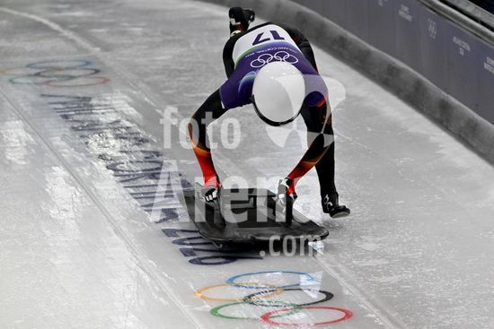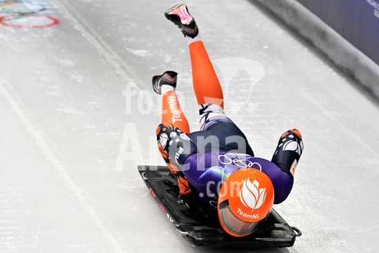 2883461 Cortina d'Ampezzo, Italia, 13 de fevereiro de 2026. Kimberley Bos, da Holanda, em acao durante as baterias 1 e 2 do skeleton feminino dos Jogos Olimpicos de Inverno de 2026 em Cortina d'Ampezzo, Italia. (Igor Kupljenik/SPP)