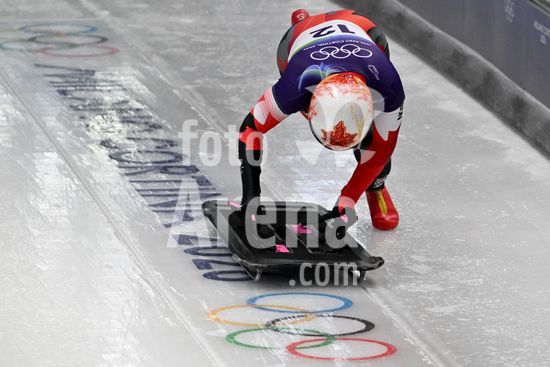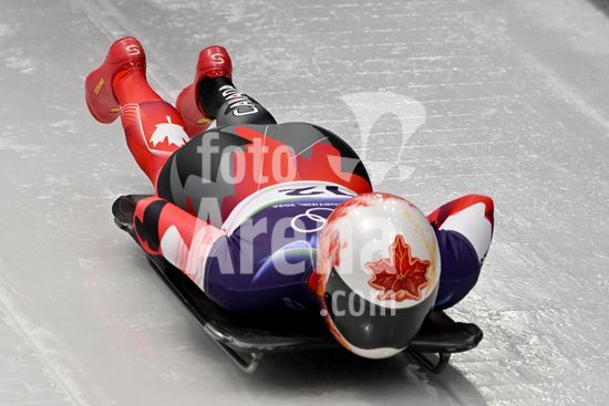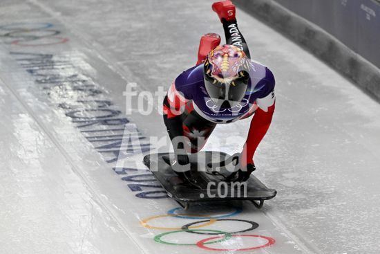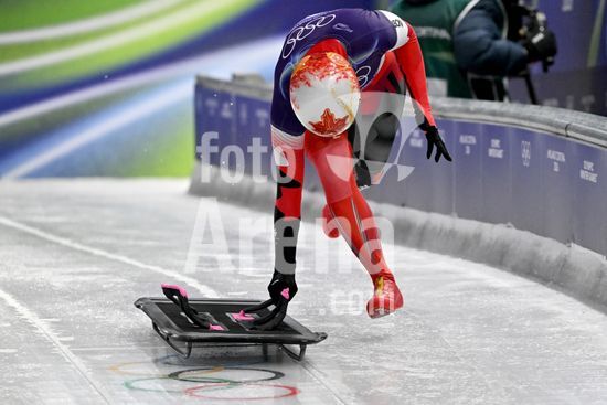 2883459 Cortina d'Ampezzo, Italia, 13 de fevereiro de 2026. Hallie Clarke, do Canada, em acao durante as baterias 1 e 2 do skeleton feminino dos Jogos Olimpicos de Inverno de 2026 em Cortina d'Ampezzo, Italia. (Igor Kupljenik/SPP)