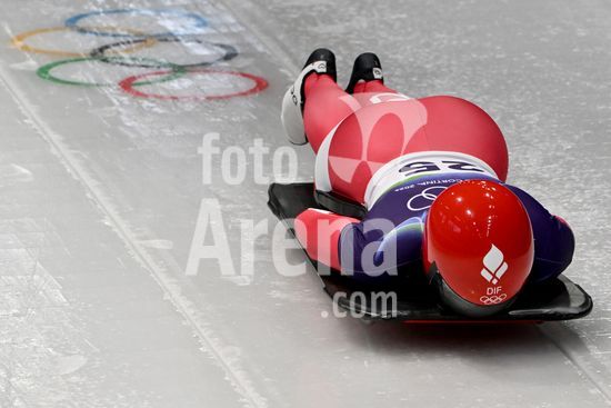2883443 Cortina d'Ampezzo, Italia, 13 de fevereiro de 2026. Janine Flock, da Austria, em acao durante as baterias 1 e 2 do skeleton feminino dos Jogos Olimpicos de Inverno de 2026 em Cortina d'Ampezzo, Italia. (Igor Kupljenik/SPP)
