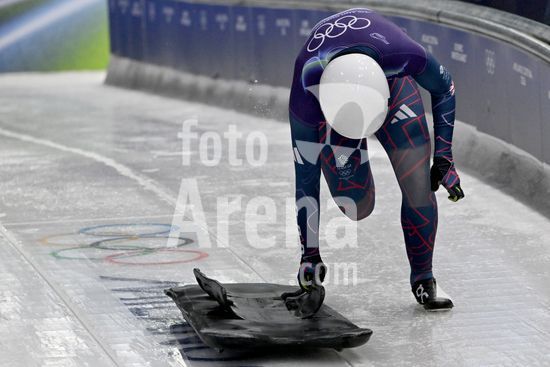 2883369 Cortina d'Ampezzo, Italia, 13 de fevereiro de 2026. Tabitha Stoecker, da Gra-Bretanha, em acao durante as baterias 1 e 2 do skeleton feminino dos Jogos Olimpicos de Inverno de 2026 em Cortina d'Ampezzo, Italia. (Igor Kupljenik/SPP)