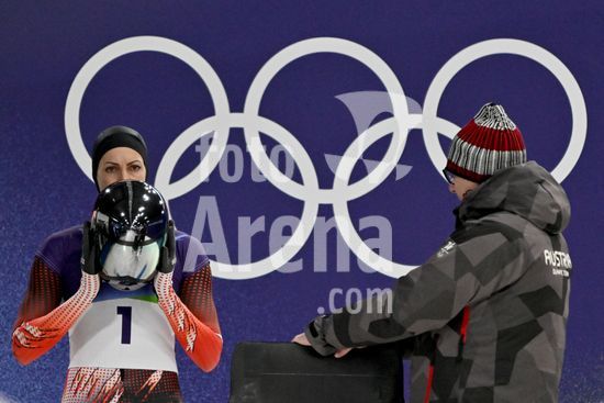 2883462 Cortina d'Ampezzo, Italia, 13 de fevereiro de 2026. Janine Flock, da Austria, antes das baterias 1 e 2 do skeleton feminino dos Jogos Olimpicos de Inverno de 2026 em Cortina d'Ampezzo, Italia. (Igor Kupljenik/SPP)