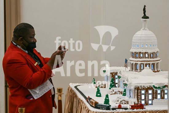 ny231222193007 A Capitol tour guide takes a photo of a gingerbread replica of the building at the Capitol in Washington, on Friday, Dec. 23, 2022. Congress on Friday cleared a roughly $1.7 trillion government funding package that would provide significant increases to national security and domestic spending and billions of dollars to aid Ukraine, sending the measure to President Biden?s desk for his signature. (Kenny Holston/The New York Times/Fotoarena)
