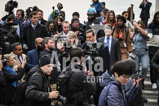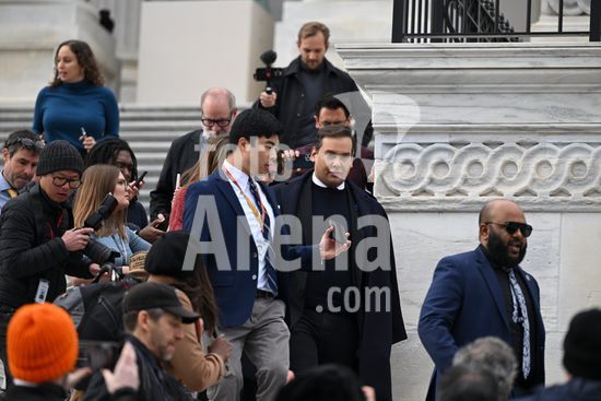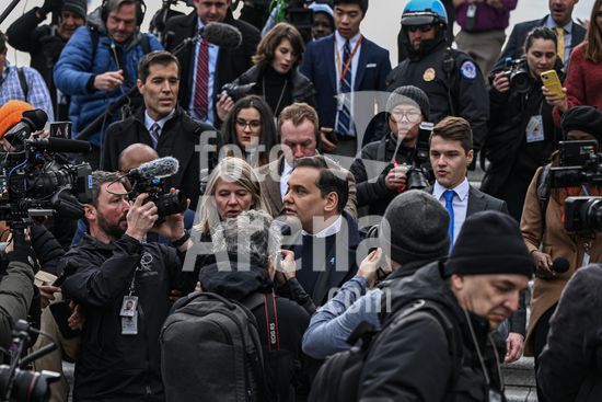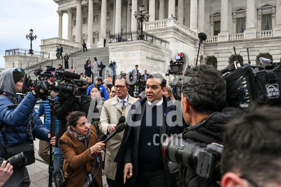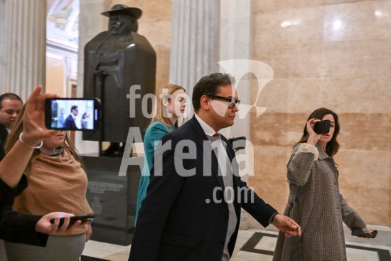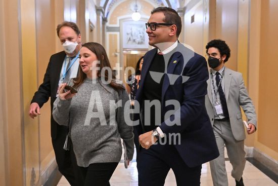 ny310123131907 FILE ? Rep. George Santos (R-N.Y.) is surrounded by reporters as he walks through the U.S. Capitol building, in Washington on Jan. 6, 2023. Santos told his colleagues on Tuesday, Jan. 31, that he would temporarily recuse himself from sitting on his congressional committees, the first crack in his defiant stance as he faces multiple investigations and calls from members of his party to resign. (Kenny Holston/The New York Times/Fotoarena)