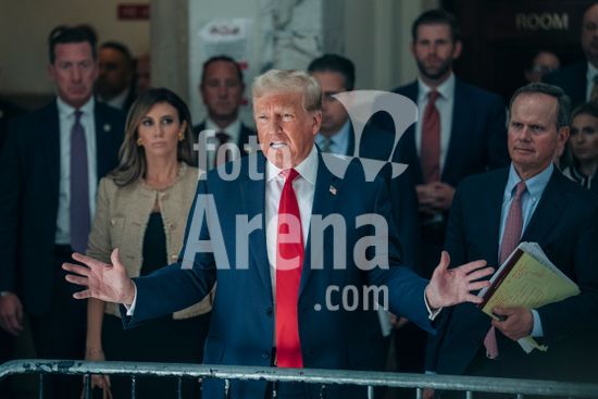 ny051023122707 Former President Donald Trump speaks to reporters outside his civil fraud trial at the State Supreme Court building in New York, on Weds., Oct. 4, 2023. Trump has escalated his violent rhetoric amid his court battles. His chaotic brand of politics inspired the far-right rebels who ousted Kevin McCarthy from his post as House speaker. (Jeenah Moon/The New York Times/Fotoarena)