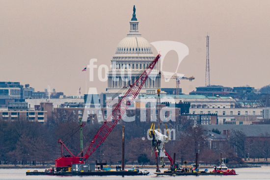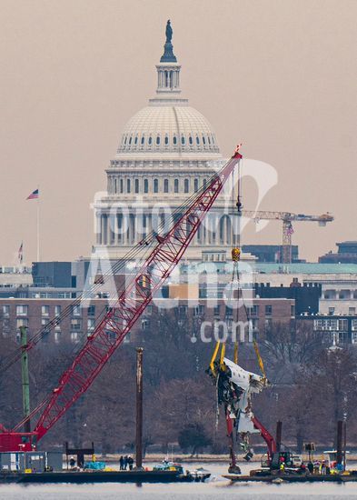ny030225190015 With the Capitol Building in the background, a crane lifts part of the fuselage from the wreckage of an American Airlines plane that crashed last week after a collision with a Black Hawk helicopter on the Potomac River in Arlington, Va., Feb. 3, 2025. Less than a week after twice enticing federal workers to resign, government officials may be walking back their overtures to some aviation safety workers. (Al Drago/The New York Times/Fotoarena)