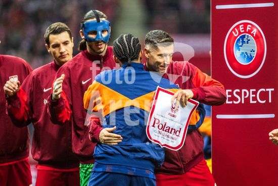2843022 Lewandowski e Depay se cumprimentam durante Polônia x Holanda realizada no Estadio Nacional de Varsóvia em Varsóvia, VA.