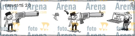 aivari24229 ADÃO ITURRUSGARAI, VARIEDADES, JORNAL O GLOBO, 22.05.2024.DiálogoFaroeste 2.0.Aumente seu pênis.Interpretação: Homem com uma arma como no faroeste. Outro aparece com um anúncio.
