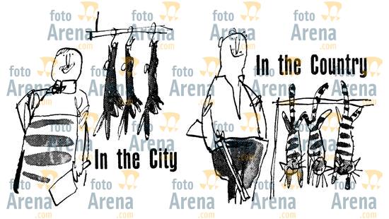 PCL111599 "In the City. In the Country. (Butcher in the city hangs rabbits, while in the country a farmer hangs cats)" *** Local Caption *** Punch cartoons by Quentin Blake
