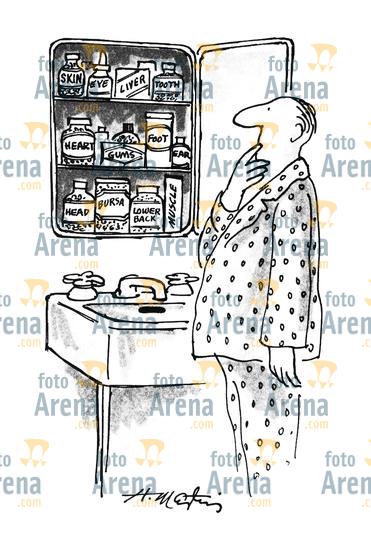 PCL107190 (a man contemplates his medicine cabinet which is full of medicines labelled with the part of the body they treat) *** Local Caption *** "Cartons about Health, Medicine and Doctors from Punch"