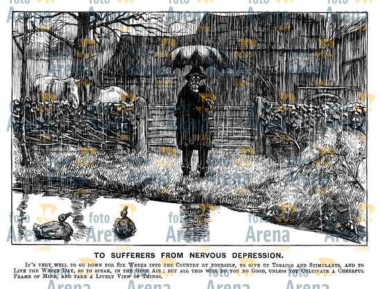 PCL108210 "To Sufferers from Nervous Depression. It's very well to go down for six weeks to the country by yourself, to give up tobacco and stimulants, and to live the whole day, so to speak, in the open air; but all this will do you no good, unless you cultivate a cheerful frame of mind, and take a lively view of things." *** Local Caption *** To Sufferers from Nervous Depression