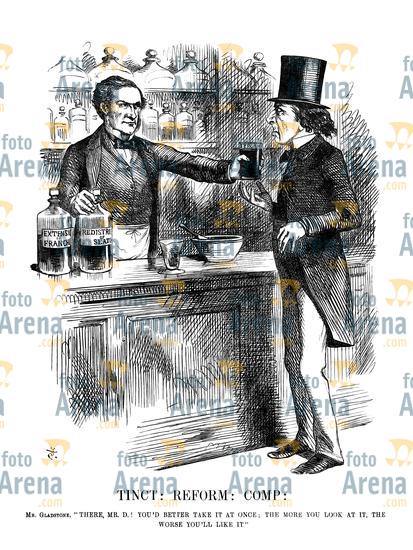 PCL108234 "Tinct : Reform : Comp. Gladstone. ""There, Mr D! You'd better take it at once; the more you look at it, the worse, you'll like it.""" *** Local Caption *** "Victorian Politics, Disraeli Cartoons from Punch magazine"