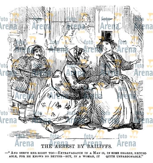 PCL108950 "The Ladies of the Creation; Or, how I was cured of being a strong-minded woman. The Arrest by Bailiffs. - ""And serve her right too - extravagance in a man is, in some degree, excuseable, for he knows no better - but, in a woman, it quite unpardonable.""" *** Local Caption *** John Leech Cartoons from Punch magazine