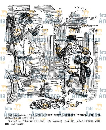 PCL108952 "The Ladies of the Creation; Or, how I was cured of being a strong-minded woman. Old Gentleman. ""You are a very saucy, impudent woman, and I'll certainly summon you!"" Conductress. ""Thank ye, sir! (To driver.) Go on, Sarah; Never mind the old cove.""" *** Local Caption *** John Leech Cartoons from Punch magazine