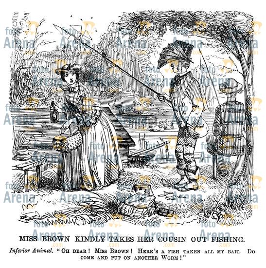 PCL108954 "The Ladies of the Creation; Or, how I was cured of being a strong-minded woman. Miss Brown Kindly Takes her Cousin out Fishing. Inferior animal. ""Oh dear! Miss Brown! Here's a fish taken all my bait. Do come and put on another worm!""" *** Local Caption *** John Leech Cartoons from Punch magazine