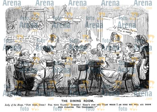 PCL108955 "The Ladies of the Creation; Or, how I was cured of being a strong-minded woman. The Dining Room. Lady of the house. ""Now then, girls! Fill your glasses! Bumpers! Here's just one toast which I am sure you will all drink with pleasure. The gentlemen!!""" *** Local Caption *** John Leech Cartoons from Punch magazine