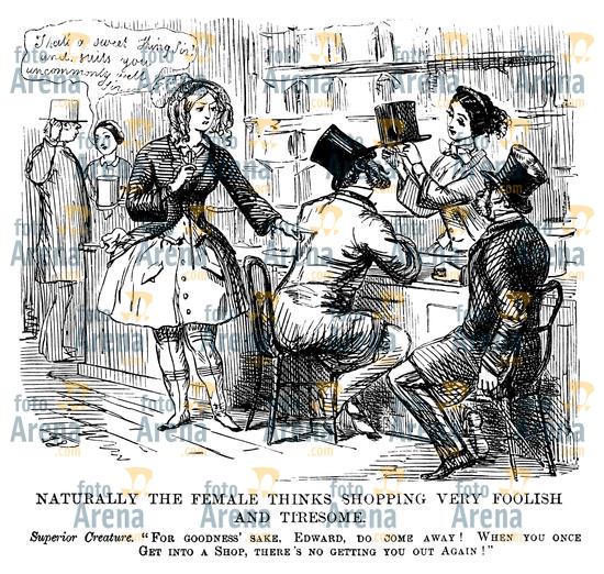 PCL108958 "The Ladies of the Creation; Or, how I was cured of being a strong-minded woman. Naturally the female thinks shopping very foolish and tiresome. Superior creature. ""For goodness' sake, Edward, do come away! When you once get into a shop, there's no getting you out again!""" *** Local Caption *** John Leech Cartoons from Punch magazine