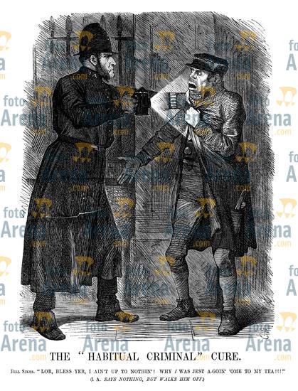 PCL109534 "The ""Habitual Criminal"" Cure. Bill Sykes. ""Lor, bless yer, I ain't up to nothin'! Why I was jest a-goin' 'ome to my tea!!!"" (IA. Says nothing, but walks him off.)"