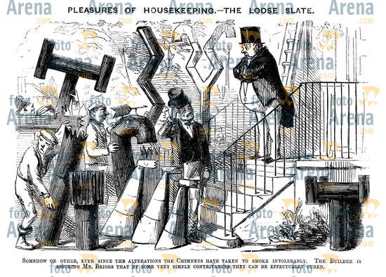 PCL110342 "Pleasures of Housekeeping.- The Loose Slate. Somehow or other, ever since the alterations the Chimneys have taken to smoke intolerably. The Builder is assuring Mr. Briggs that by some very simple contrivances they can be effectually cured." *** Local Caption *** John Leech Cartoons from Punch magazine