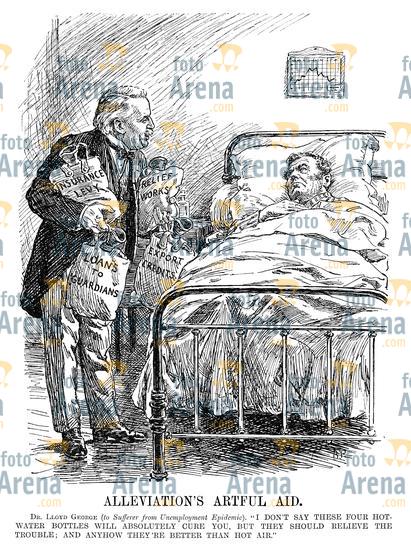 PCL113405 "Alleviation's Artful Aid. Dr Lloyd George (to sufferer from Unemployment Epidemic). ""I don't say these four hot water bottles will absolutely cure you, but they should relieve the trouble; And anyhow they're better than hot air."" (Lloyd George offers John Bull a remedy of hot water bottles 'Insurance Levy', 'Relief Works', 'Loans to Guardians' and 'Export Credits')" *** Local Caption *** Alleviation's Artful Aid Bernard Partridge Cartoons from Punch magazine