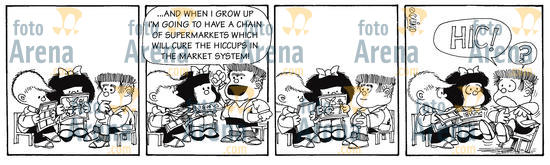 0165en TIRA MAFALDA, CÓDIGO ORIGINAL 0165, INGLÊS, EDICIONES DE LA FLORDiálogoManolito: ...and when I grow u I'm going to have a chain of supermarkets which will cure the hiccups in the market system!