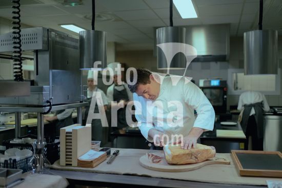ny120125183211 Aurelien Gransagne, a chef, slices a Florus Solatium ham in the kitchen at Serge Vieira Gourmet Restaurant in Chaudes-Aigues, France on Nov. 8, 2024. A dispute over a project to cure hams in a bell tower underscored the difficulties that churches in France face trying to pay for restorations. (Dmitry Kostyukov/The New York Times/Fotoarena)