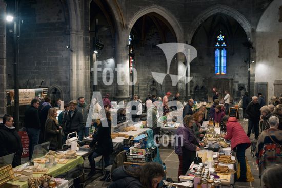 ny120125183215 People shop at an Indoor market at the Eglise Notre-Dame de Saint-Flour in Saint-Flour, France on Nov. 8, 2024. A dispute over a project to cure hams in a bell tower underscored the difficulties that churches in France face trying to pay for restorations. (Dmitry Kostyukov/The New York Times/Fotoarena)