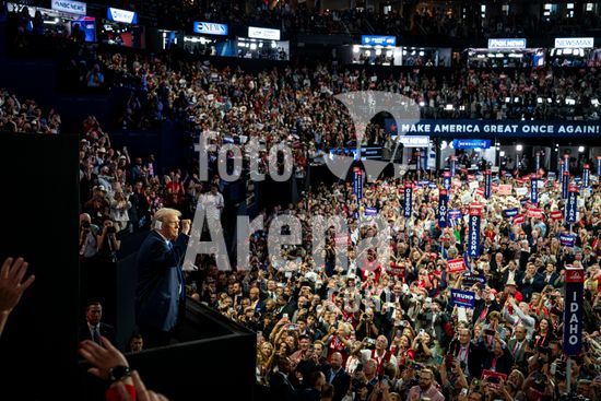 Former President Donald Trump arrives on the second night of the Republican National Convention at the Fiserv Forum in Milwaukee, Wis., on Tuesday, July 16, 2024. A sea of Republicans greeted Trump with cheers and thunderous applause as he appeared at the Republican National Convention this week in Milwaukee, just days after his attempted assassination. He responded by pumping his fist in the air. (Haiyun Jiang/The New York Times/Fotoarena)