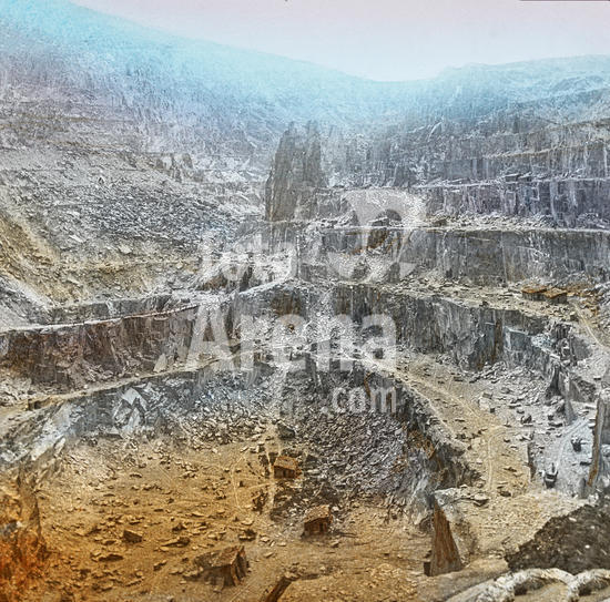 Magic Lantern slide circa 1900 hand coloured. created in 1887. A tour of North Wales. 18 Penrhyn Slate Quarries.?These are the property of Lord Penrhyn, and an inspection will well repay the tourist. They are of very large extent, being nearly a mile across from one side to the other, and every modern mechanical arrangement is brought to bear upon the working of them. Everything in connection, from the busy toilers to the tremendous ranges of galleries formed one above another, combine to produce astonish-ment at the enterprise which has so usefully employed these mountain wastes. The usual blasts take place every hour, when the noise rolls along the mountain sides like peals of thunder. An immense pillar of rock, computed to weigh 125,000 tons, that had been left near the middle of the Quarry was blown up in April, 1895, by two blasts of powder amounting to seven tons. There are 3,000 persons engaged in these Quarries, and an average of 200 tons of slates is daily conveyed to the port at Bangor.