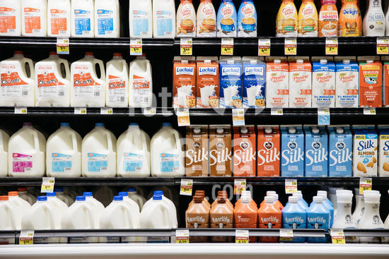 ny130320221704 **EMBARGO: No electronic distribution, Web posting or street sales before Saturday at 6 a.m. ET March 14, 2020. No exceptions for any reasons. EMBARGO set by source.** Shelves of both dairy and non-dairy choices at an IGA grocery in Bowling Green, Ky., March 11, 2020. While nondairy milk has risen from the dusty shelves of health-food stores to Times Square billboards and supermarkets around the country, dairy farmers have faced economic turmoil. (Brett Carlsen/The New York Times/Fotoarena)