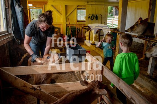 ny140622170905 Hilary Haigh, with her sons William, 5, and Emitt, 3, feeds calves at their Rolling Bale Farm in Shoreham, Vt., May 18, 2022. Haigh and her husband recently bought a herd of 10 Jersey dairy cows from Diane St. Clair, who for 22 years has been making the most sought-after small-batch cultured butter in the U.S., and are continuing with her small dairy?s methods. (Hilary Swift/The New York Times/Fotoarena)