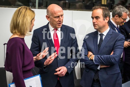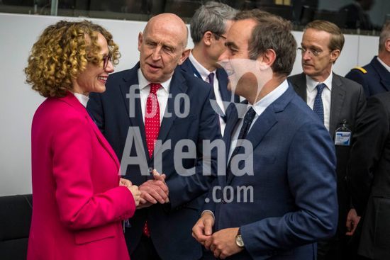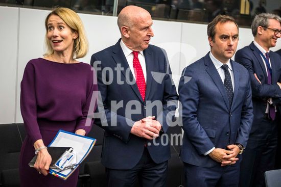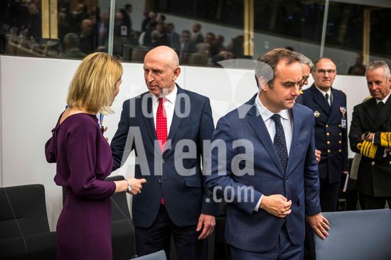 20250410_faf_w80_051 April 10, 2025: (L-R) Kaja Kallas , high Representative for Foreign Affairs and Security Policy and Vice-President of the European Commission , John Healey, Secretary of State for Defence of the United Kingdom and Sébastien Lecornu, Minister of Armed Forces of France attend the Coalition of the Willing meeting co-hosted by France and the United Kingdom at NATO headquarters in Brussels, Belgium, on 10.04.2025. The session brings together allied defence ministers to strengthen cooperation on military readiness and coordinated defence strategies..Photo by Wiktor Dabkowski (Credit Image: © Wiktor Dabkowski/ZUMA Press Wire)