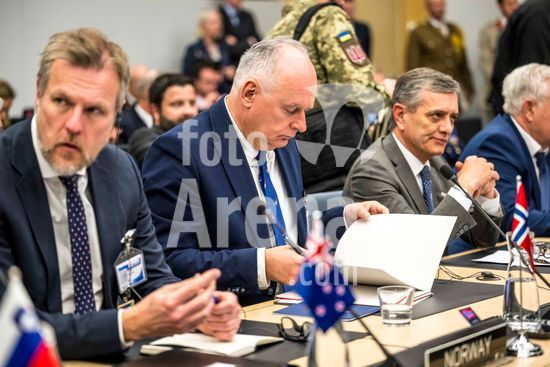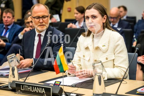20250410_faf_w80_020 April 10, 2025: Laurynas Kas?i?nas, Minister of National Defence of Latvia and DovilÄ? ?akalienÄ? Defence Minister of Lithuania attend the Coalition of the Willing meeting co-hosted by France and the United Kingdom at NATO headquarters in Brussels, Belgium, on 10.04.2025. The session brings together allied defence ministers to strengthen cooperation on military readiness and coordinated defence strategies..Photo by Wiktor Dabkowski (Credit Image: © Wiktor Dabkowski/ZUMA Press Wire)