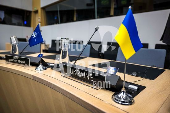 20250410_faf_w80_022 April 10, 2025: Ukrainian seat at the table with the flag during the Coalition of the Willing meeting co-hosted by France and the United Kingdom at NATO headquarters in Brussels, Belgium, on 10.04.2025. The session brings together allied defence ministers to strengthen cooperation on military readiness and coordinated defence strategies..Photo by Wiktor Dabkowski (Credit Image: © Wiktor Dabkowski/ZUMA Press Wire)