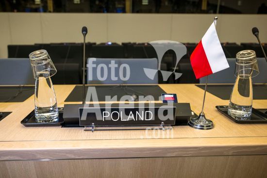 20250410_faf_w80_024 April 10, 2025: Polish seat at the table with the Polish flag during the Coalition of the Willing meeting co-hosted by France and the United Kingdom at NATO headquarters in Brussels, Belgium, on 10.04.2025. The session brings together allied defence ministers to strengthen cooperation on military readiness and coordinated defence strategies..Photo by Wiktor Dabkowski (Credit Image: © Wiktor Dabkowski/ZUMA Press Wire)