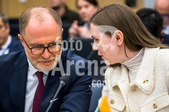 20250410_faf_w80_046 April 10, 2025: Laurynas Kas?i?nas, Minister of National Defence of Latvia and DovilÄ? ?akalienÄ? Defence Minister of Lithuania attend the Coalition of the Willing meeting co-hosted by France and the United Kingdom at NATO headquarters in Brussels, Belgium, on 10.04.2025. The session brings together allied defence ministers to strengthen cooperation on military readiness and coordinated defence strategies..Photo by Wiktor Dabkowski (Credit Image: © Wiktor Dabkowski/ZUMA Press Wire)
