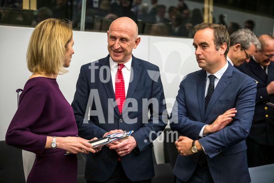 20250410_faf_w80_011 April 10, 2025: (L-R) Kaja Kallas , high Representative for Foreign Affairs and Security Policy and Vice-President of the European Commission , John Healey, Secretary of State for Defence of the United Kingdom and Sébastien Lecornu, Minister of Armed Forces of France attend the Coalition of the Willing meeting co-hosted by France and the United Kingdom at NATO headquarters in Brussels, Belgium, on 10.04.2025. The session brings together allied defence ministers to strengthen cooperation on military readiness and coordinated defence strategies..Photo by Wiktor Dabkowski (Credit Image: © Wiktor Dabkowski/ZUMA Press Wire)