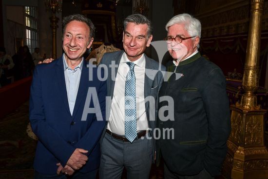 20250410_zia_a189_150 April 10, 2025, Paris, Ile-De-France, France: Radio host and television presenter Stephane Bern poses with architect Jacques Garcia and president of Mobilier National Herve Lemoine at â??Le Dernier Sacreâ? exhibition at the Mobilier National in Paris on April 10, 2025. (Credit Image: © Abdullah Firas/Abaca/Zuma Press/Fotoarena)