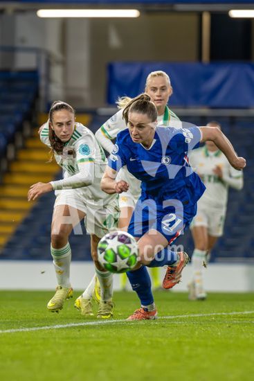 2857301 Niamh Charles (21 Chelsea) disputa a bola durante a partida entre Chelsea e Roma pela fase de grupos da Liga dos Campeoes Feminina da UEFA, em Stamford Bridge, Londres, Inglaterra, na quarta-feira, 10 de dezembro de 2025. (Claire Jeffrey / SPP)