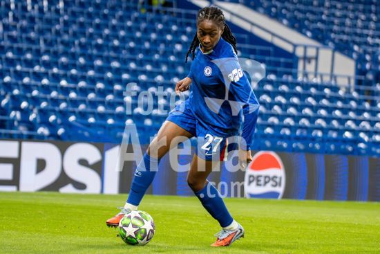 2857305 Sandy Baltimore (17 Chelsea) equilibra a bola no pe antes da partida entre Chelsea e Roma pela fase de grupos da Liga dos Campeoes Feminina da UEFA, em Stamford Bridge, Londres, Inglaterra, na quarta-feira, 10 de dezembro de 2025. (Claire Jeffrey / SPP)