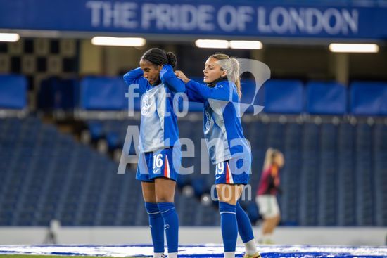 2857306 Alyssa Thompson (12 Chelsea) aquece antes da partida entre Chelsea e Roma pela fase de grupos da Liga dos Campeoes Feminina da UEFA, em Stamford Bridge, Londres, Inglaterra, na quarta-feira, 10 de dezembro de 2025. (Claire Jeffrey / SPP)