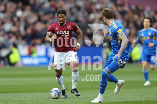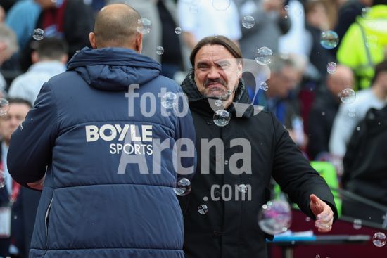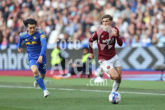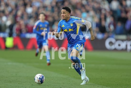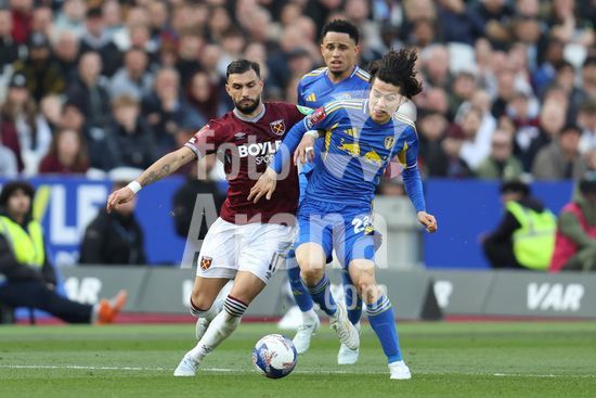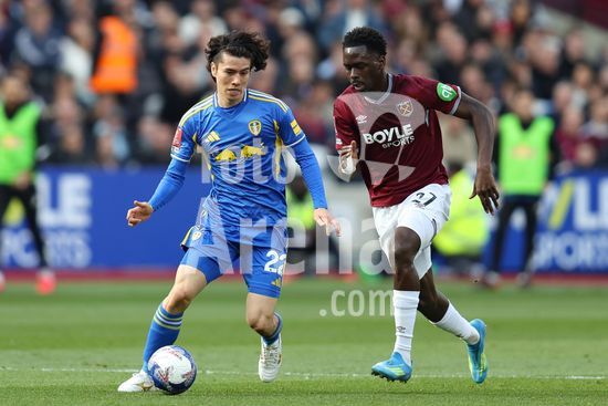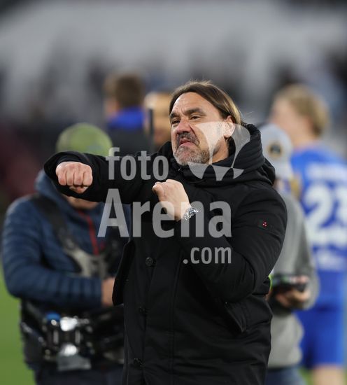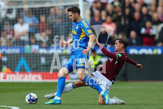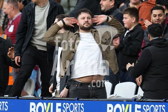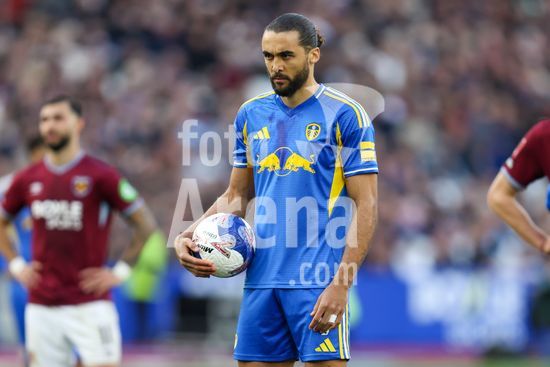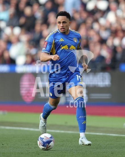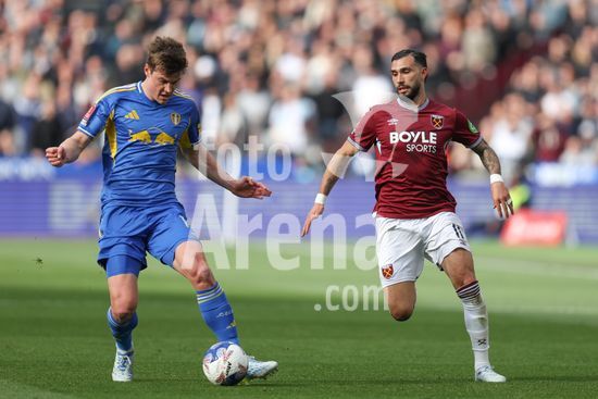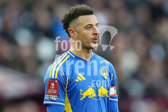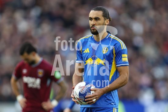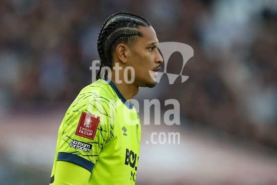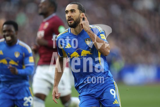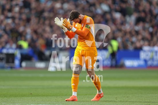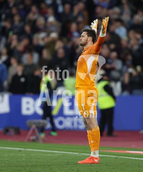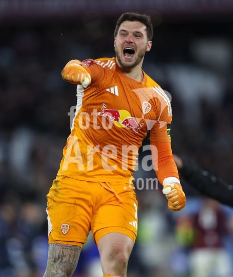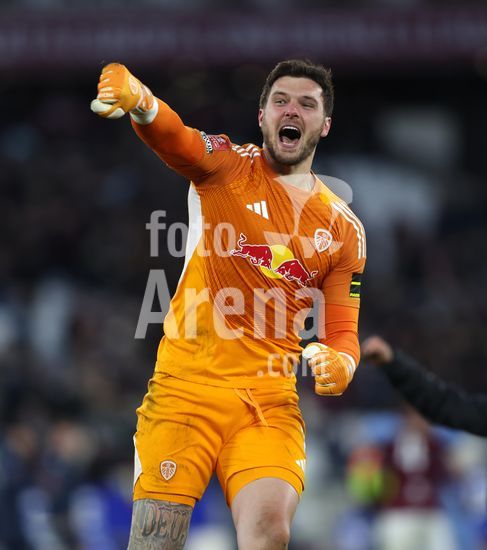 LONDRES, INGLATERRA, 5 DE ABRIL: Lucas Perri, do Leeds United, comemora com os torcedores do Leeds United apos vencer a disputa de penaltis contra o West Ham United durante a partida entre West Ham United FC e Leeds United FC pelas quartas de final da Emirates FA Cup, no Estadio Olimpico de Londres, em Londres, Inglaterra, em 5 de abril. (Daniel Weir/Sports Press Photo / SPP)