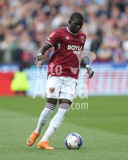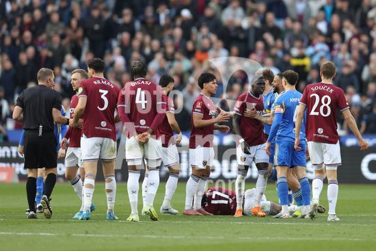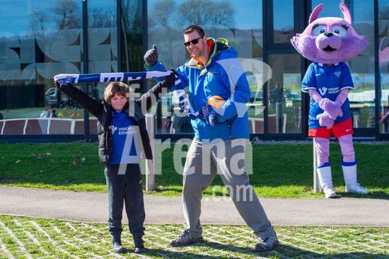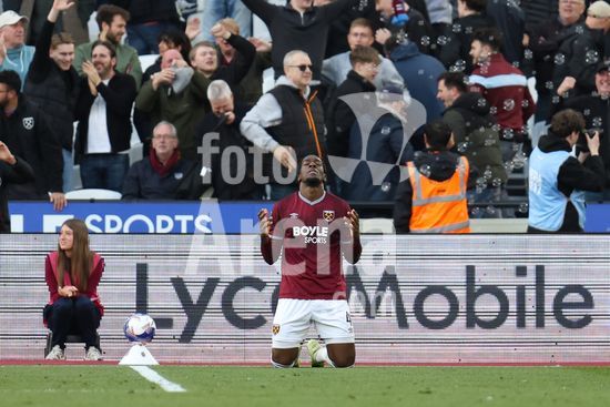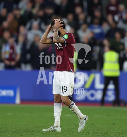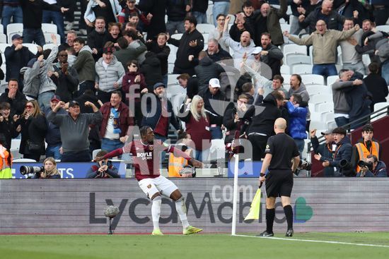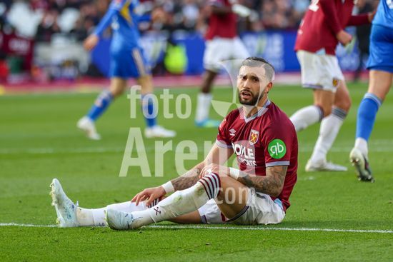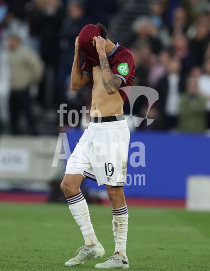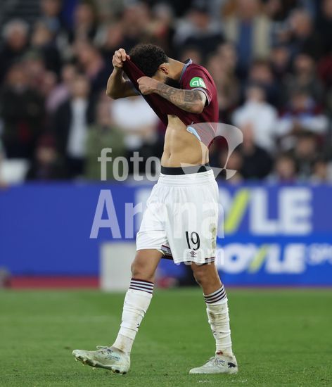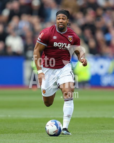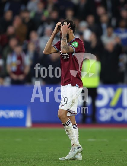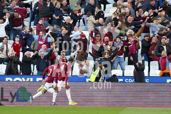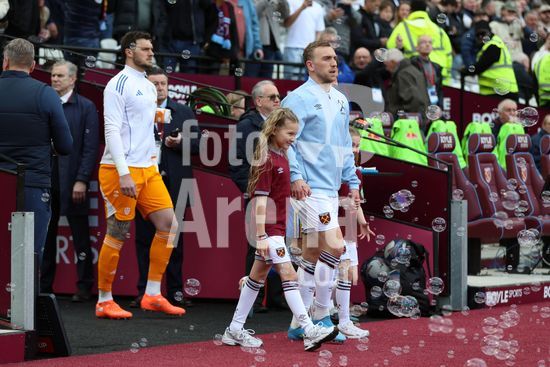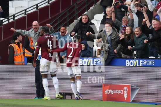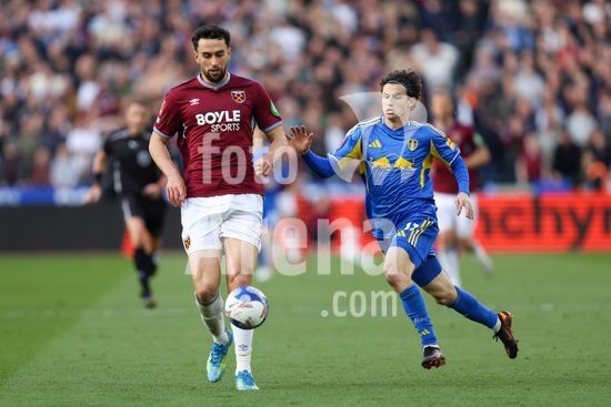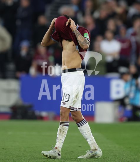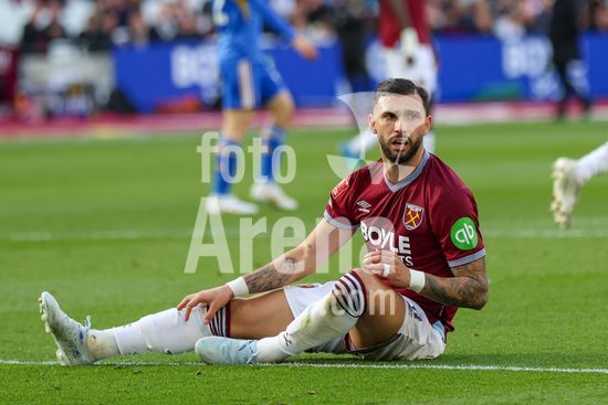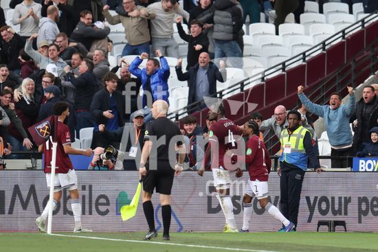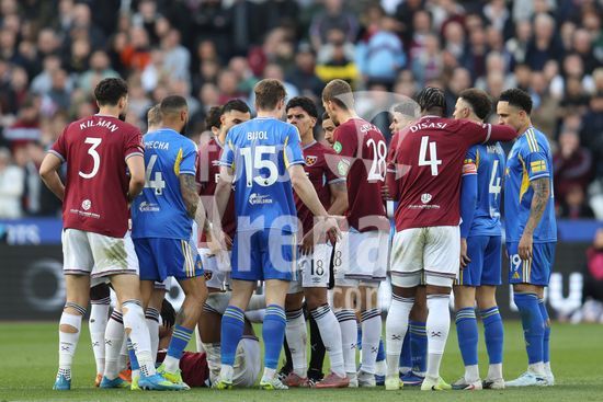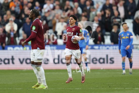 LONDRES, INGLATERRA, 5 DE ABRIL: Lucas Perri, do Leeds United, comemora com os torcedores do Leeds United apos vencer a disputa de penaltis contra o West Ham United durante a partida entre West Ham United FC e Leeds United FC pelas quartas de final da Emirates FA Cup, no Estadio Olimpico de Londres, em Londres, Inglaterra, em 5 de abril. (Daniel Weir/Sports Press Photo / SPP)