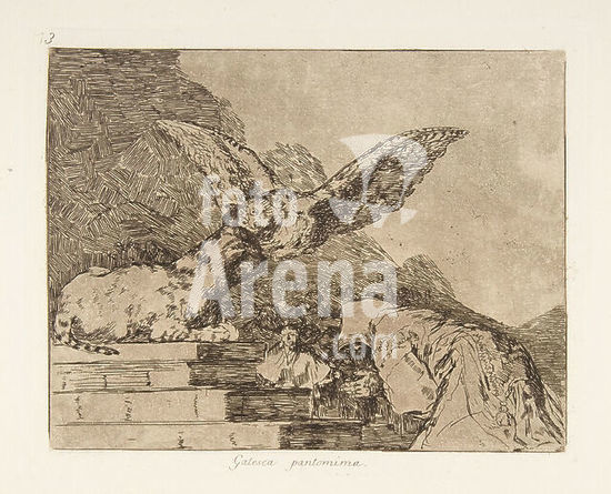 alb3650369 Plate 73 from 'The Disasters of War' (Los Desastres de la Guerra): 'Feline pantomime.' (Gatesca pantomima.). Artist: Goya (Francisco de Goya y Lucientes) (Spanish, Fuendetodos 1746-1828 Bordeaux). Dimensions: Plate: 6 7/8 × 8 3/8 in. (17.4 × 21.2 cm)Sheet: 9 5/8 × 13 9/16 in. (24.4 × 34.5 cm). Series/Portfolio: The Disasters of War. Date: after 1814-15 (published 1863). Museum: Metropolitan Museum of Art, New York, USA.