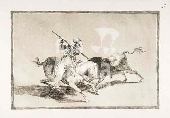 alb3670049 Plate 5 from 'The Tauromaquia': The spirited Moor Gazul is the first to spear bulls according to the rules. Artist: Goya (Francisco de Goya y Lucientes) (Spanish, Fuendetodos 1746-1828 Bordeaux). Dimensions: Plate: 9 3/4 x 13 7/8 in. (24.7 x 35.2 cm)Sheet: 12 3/16 × 17 1/2 in. (31 × 44.5 cm). Date: 1816. Museum: Metropolitan Museum of Art, New York, USA.