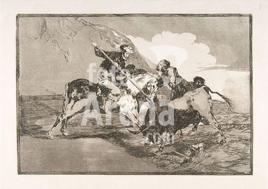 alb3676833 Plate 1 from 'The Tauromaquia': The way in which the ancient Spaniards hunted bulls on horseback in the open country. Artist: Goya (Francisco de Goya y Lucientes) (Spanish, Fuendetodos 1746-1828 Bordeaux). Dimensions: Plate: 9 3/4 x 13 3/4 in. (24.8 x 35 cm)Sheet: 12 x 17 3/16 in. (30.5 x 43.7 cm). Date: 1816. Museum: Metropolitan Museum of Art, New York, USA.