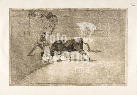 alb3678983 Plate 33 from the 'Tauromaquia': The unlucky death of Pepe Illo in the ring at Madrid. Artist: Goya (Francisco de Goya y Lucientes) (Spanish, Fuendetodos 1746-1828 Bordeaux). Dimensions: Plate: 9 11/16 × 13 3/4 in. (24.6 × 35 cm)Sheet: 12 1/8 × 17 1/4 in. (30.8 × 43.8 cm). Date: 1816. Museum: Metropolitan Museum of Art, New York, USA.